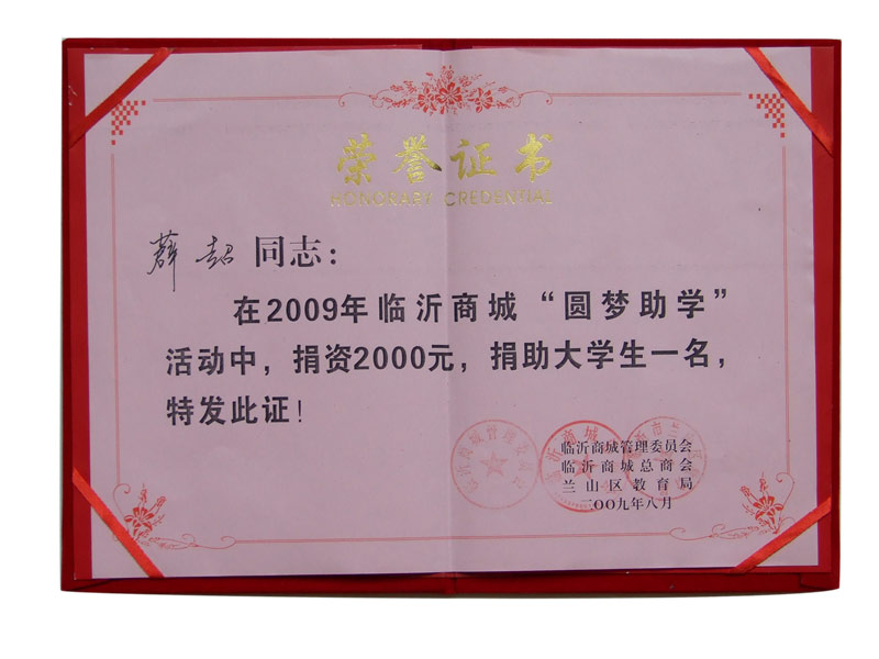 董事長薛超助學證書